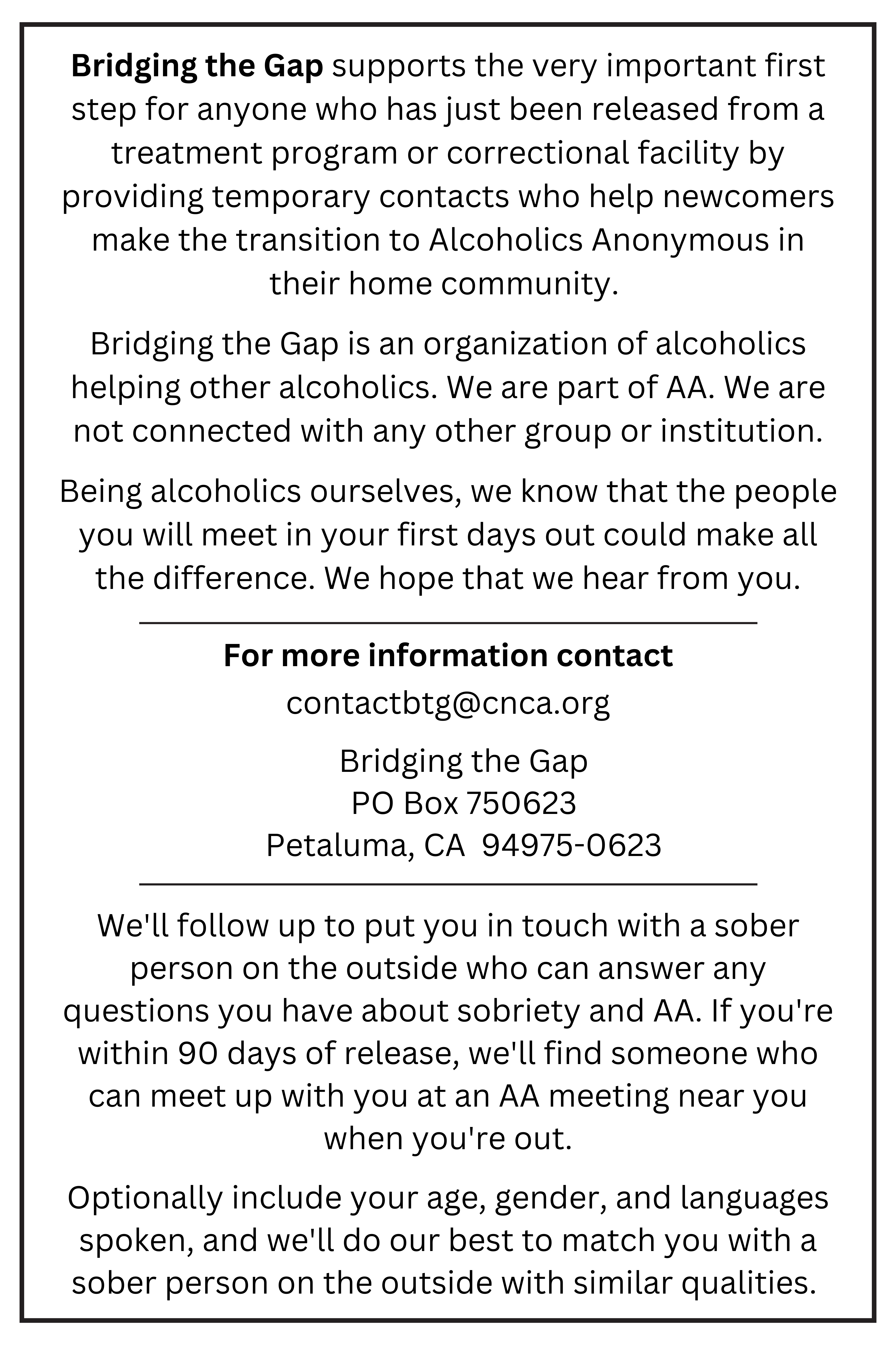 Contact with local A.A. office or A.A. member immediately upon release – hand out Bridging the Gap cards if appropriate.